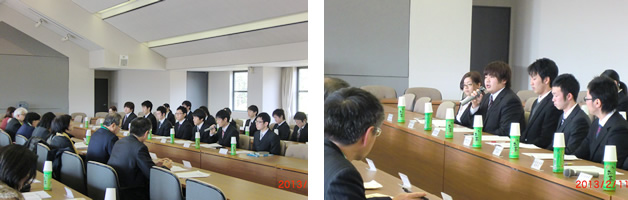 平成25年2月11日(月・祝)13時00分~15時00分 福利厚生棟地下1階食堂 懇談会出席の後援会・事務局・学生代表者に加え、 各クラブ・サークルの代表者や部員、一般学生等(学生の参加者は計130名) |