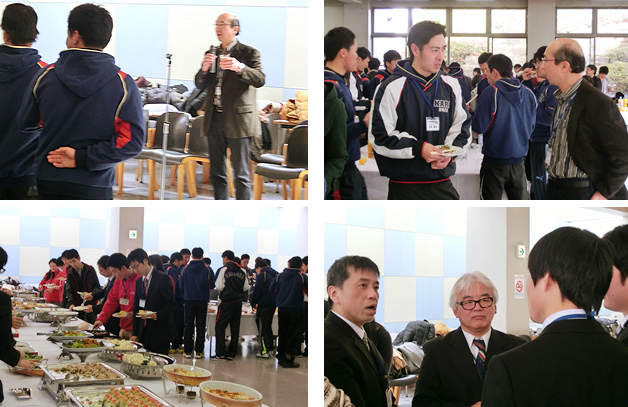 平成27年2月11日(水・祝)13時00分~15時00分 福利厚生棟地下1階食堂 懇談会出席の後援会・事務局・学生代表者に加え、 各クラブ・サークルの代表者や部員、一般学生等(学生の参加者は計140名) |
