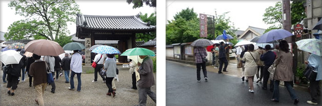 会員の方々に奈良や京都の歴史・文化を理解していただこうということで、例年見学会を実施しております。今年度は「古代の奈良・現代の奈良を歩く 元興寺・十輪院・興福寺」と題して奈良市内ならまち近辺を訪れました。255名の方に参加していただき、観光バス8台に分乗、午後1時過ぎに大学を出発し、見学地に向かいました。昼食時からバスの号車毎に別れていただき、見学会終了まで各号車単位で行動していただきました。元興寺では、住職の貴重なお話を聞くことができ、本堂に隣接する宝物殿には、貴重な資料が展示されていました。