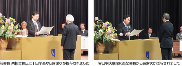 総会終了後、退任役員の方々に、学長表彰、後援会長表彰として、感謝状が贈呈されました。退任役員を代表して、前会長 栗柳哲也氏に千田学長から感謝状が授与されました。