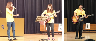 ♪総会前のミニコンサート♪アコースティックサークルの学生の皆さんによる演奏会がありました。親たちの世代にぴったりな選曲での演奏に、会場からは手拍子も!! ★講堂ロビーでのミニ作品展示会★